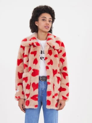 Manteau en fausse fourrure à imprimé cœurs rouges sur fond écru de Topshop