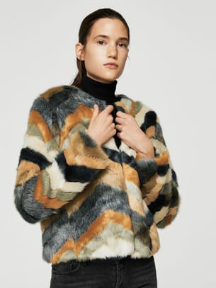 Manteau court en fausse fourrure multicolore avec motif chevrons et couleurs automnales de Mango