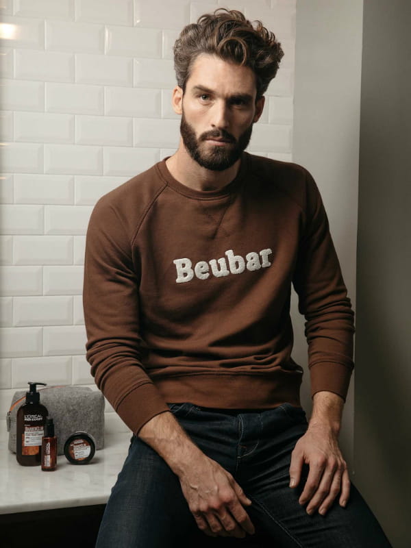 Pull "Beubar" en coloris chocolat avec sa trousse de toilette contenant 3 produits de la gamme "Barber Club" de L'Oréal Men Expert