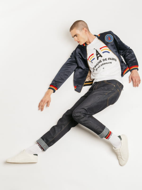 Blouson tendance avec manches côtelées tricolores (bleu, moutarde et rouge) et t-shirt floqué assorti issus de la collab' PSG X Blune X Commune de Paris