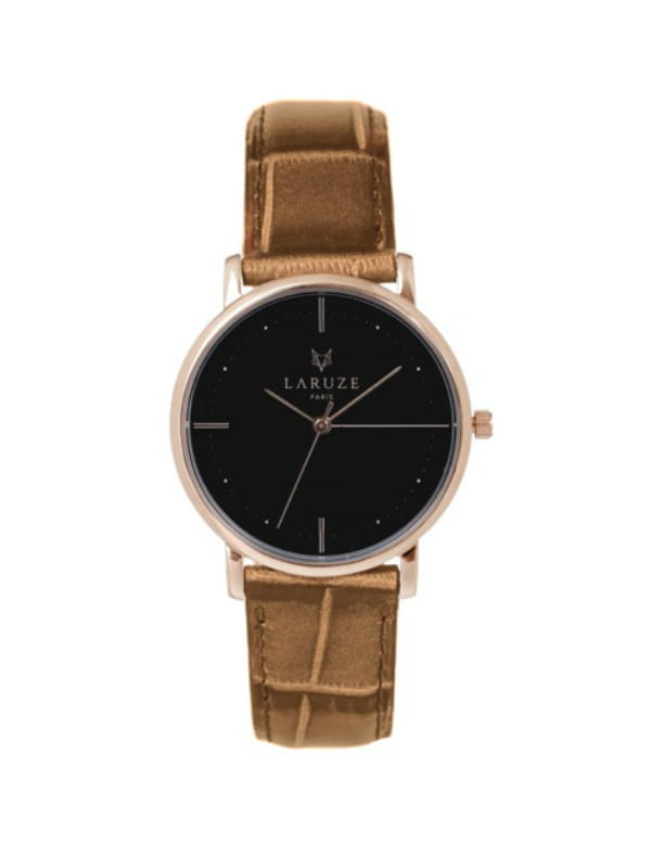 Montre marron avec cadran noir, carrure en or rose et bracelet interchangeable en cuir façon croco de Laruze