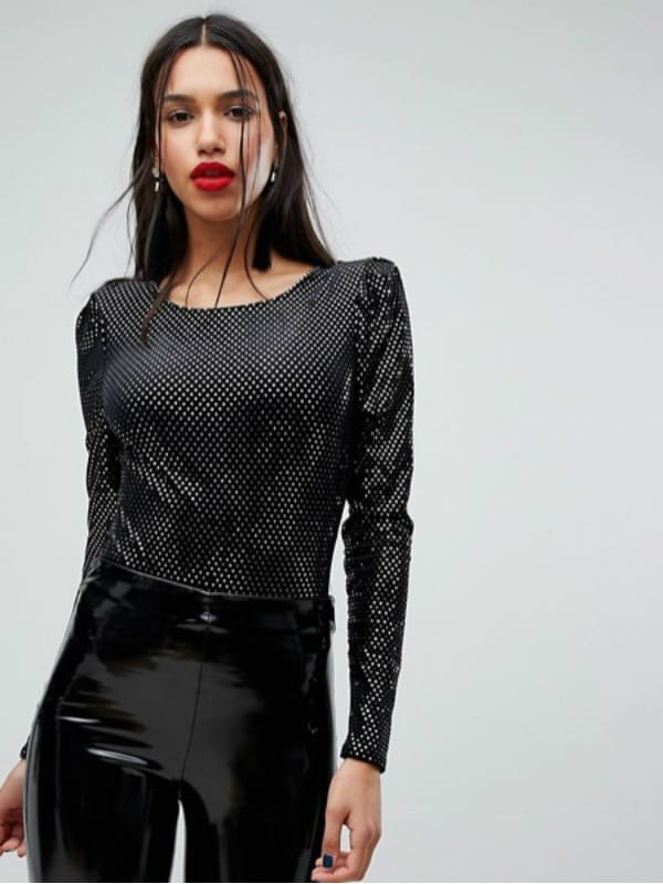 Body à manches longues et épaules bouffantes avec imprimé pois blancs et effet métallisé de River Island sur Asos