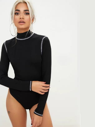 Body à col montant et manches longues en coloris noir avec coutures contrastées aux épaules et au col de Prettylittlething