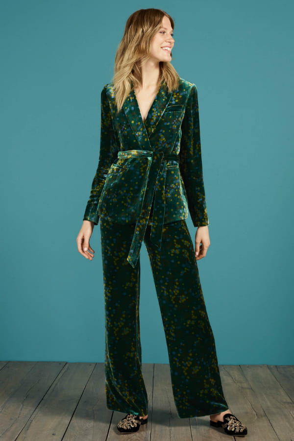 Ensemble pantalon évasé et veste ceinture en velours vert imprimé de Boden