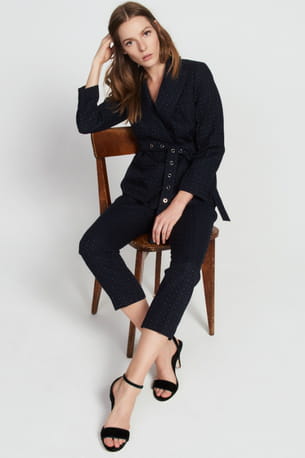 Ensemble veste ceinturée et pantalon court marine à plumetis de Sandro
