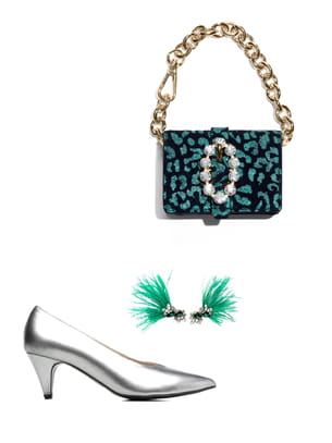 Escarpins en cuir argent de Sarenza, bijoux de chaussures vert à plumes de Sarenza X Shourouk et mini sac léopard vert de & Other Stories