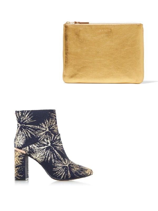 Bottines en jacquard marine et dorées de Dune et pochette métallisée de Comme des Garons sur Net à Porter
