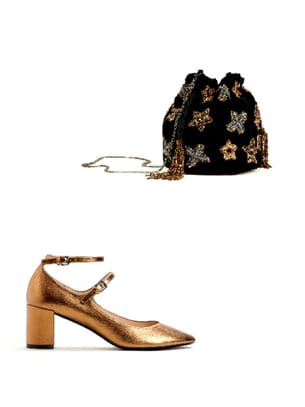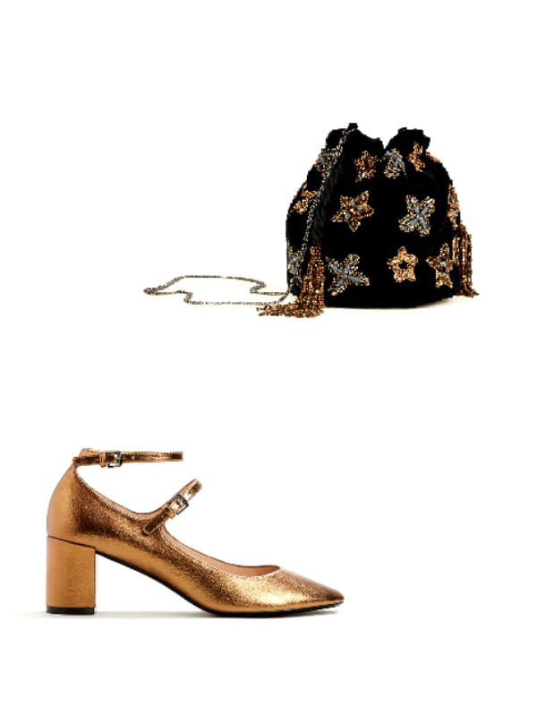 Bourse en velours brodée noire de 123 et escarpins à brides cuivre de Mango
