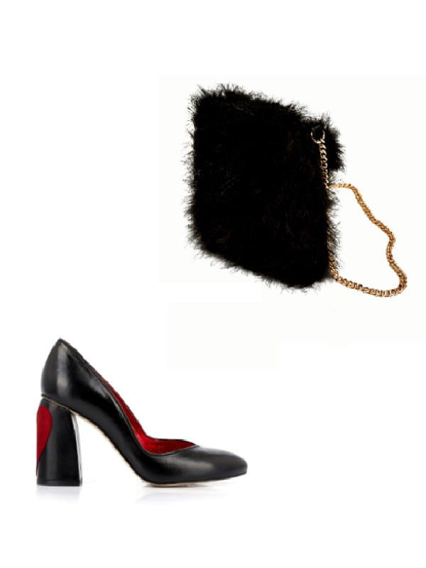 Escarpins en cuir avec cœur noirs de Mellow Yellow et sac en plumes noir de Zara