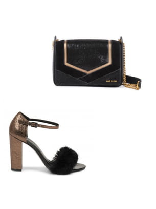 Petit sac en cuir noir et doré de Nat et Nin et sandales à talon en cuir mordorées de André