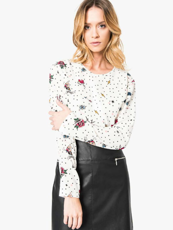 Blouse à manches longues avec fond écru et motifs de petits oiseaux, fleurs et papillons de Gémo