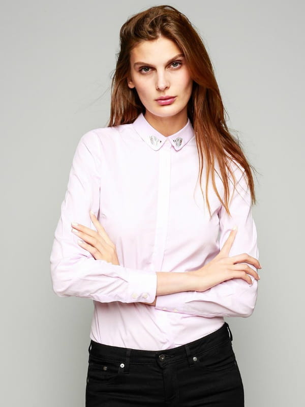 Chemisier en twill rose pâle avec broderies en forme de cygne sur le col de Maison Labiche