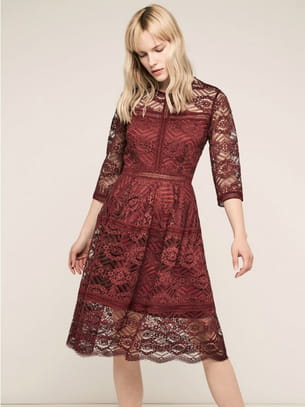 Robe patineuse à manches 3/4 en dentelle piquée de broderie avec jeux de transparence en coloris rouge de Gérard Darel