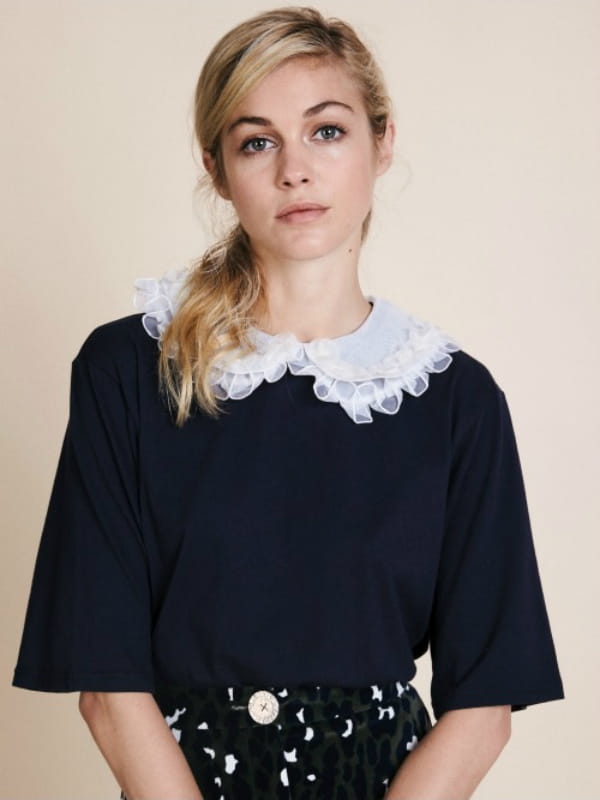 Haut bleu marine à manches courtes avec ouverture dans le dos et col blanc victorien de Manoush