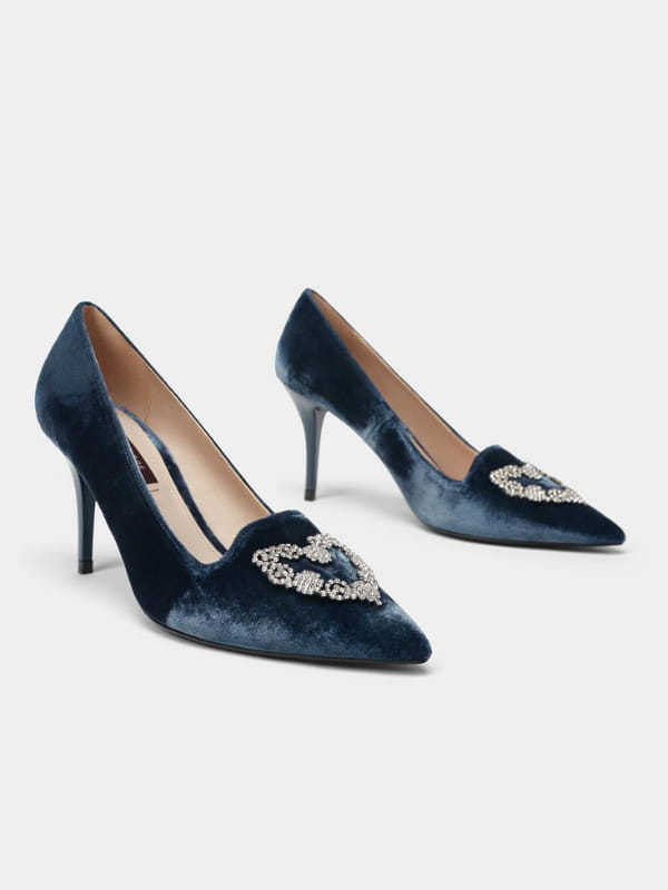 Escarpins bleus en velours avec cœur orné de brillants sur l'empeigne de Uterqüe