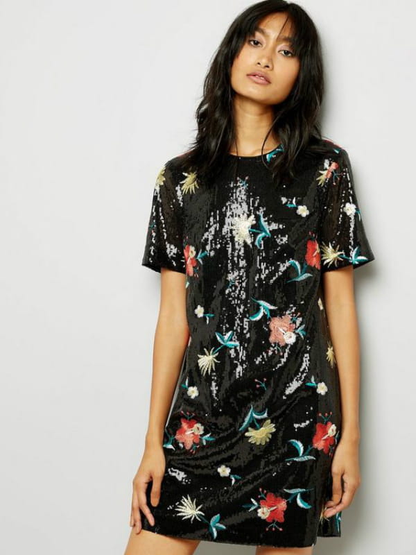 Robe droite courte brodée de fleurs à sequins noirs de New Look