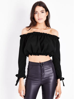 Crop top avec décolleté Bardot, détails de fronces et manches trois quarts en coloris noir de New Look