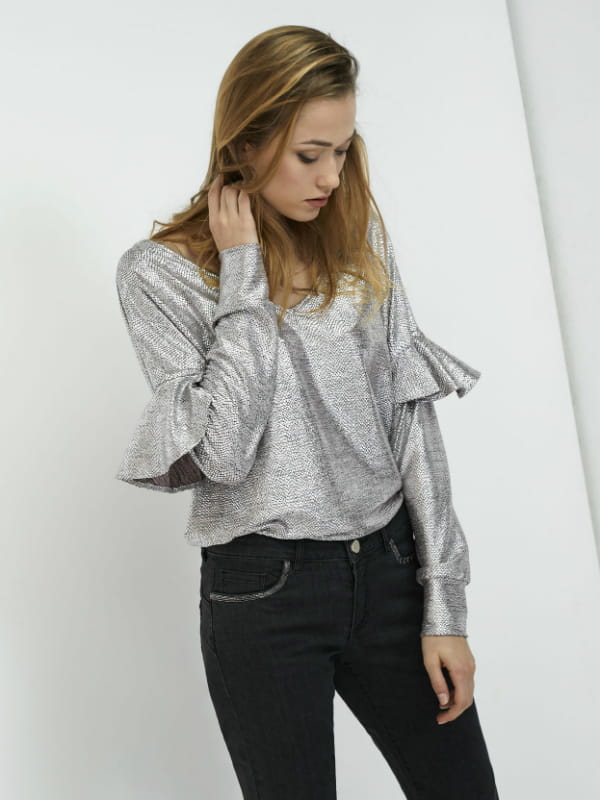 Blouse à manches longues à volants en tissu argenté et lamé avec légère imitation python de I.code