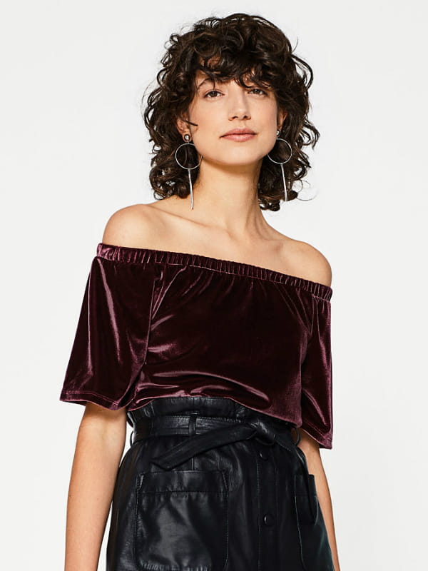 Haut en velours stretch avec coupe bustier façon Bardot et manches courtes en coloris bordeaux de Esprit