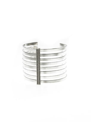 Manchette argentée composée de plusieurs bracelets fins reliés par une colonne de strass de Moa