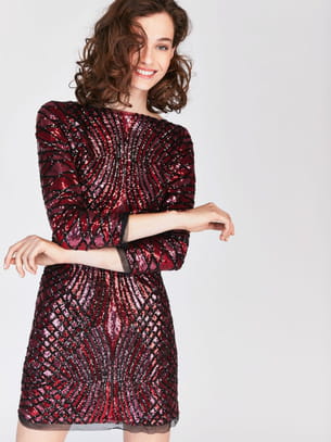 Robe rouge échancrée dans le dos recouverte de sequins qui forment un motif géométrique façon écailles de Tara Jarmon
