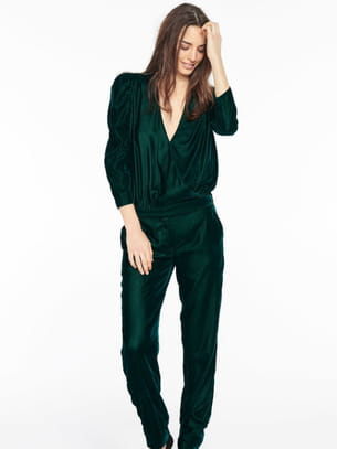 Combinaison verte satinée avec décolleté cache-cœur et épaules bouffantes de Ba&sh