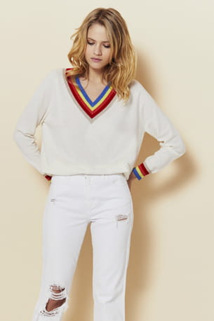 Non, le cachemire n'est pas une matière hivernale exclusivement ! Aujourd'hui, les griffes spécialisées proposent de sublimes produits estivaux 100% cachemire très légers, parfaits pour la belle saison. La preuve en est, ce sublime pull blanc signé Kujten avec sa coupe boyfriend, son col V et ses emmanchures soulignés de rayures colorées, ambiance tennisman rétro. On adhère au côté ample parfait pour le printemps et la fraîcheur de sa gamme chromatique. De quoi passer les mois à venir blottie dans la douceur.
