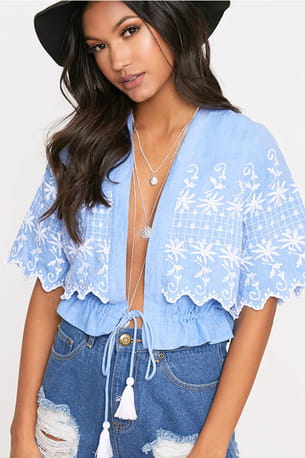 Ouvert ou noué, porté par dessus un body blanc avec un jean ou un short taille haute, le chemisier en chambray bleu de PrettyLittleThing nous séduit par son côté résolument sexy mais aussi son style bohème. Avec ses broderies blanches et ses deux pompons, il est la pièce idéale pour un look estival glamour et tendance. De quoi briller dans les festivals les plus branchés !