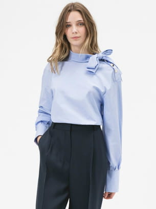 Chemisier en coton bleu ciel avec col retourné formant un nœud sur le côté et boutons dorés à l'épaule de Figaret
