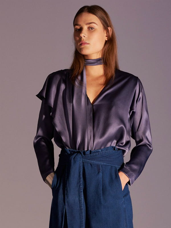 Chemisier en soie avec manches longues, col V et choker intégré en coloris bleu de Prusse de Masscob