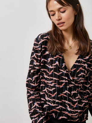 Blouse noire cache-cœur à manches longues avec imprimé cigognes roses de Swildens