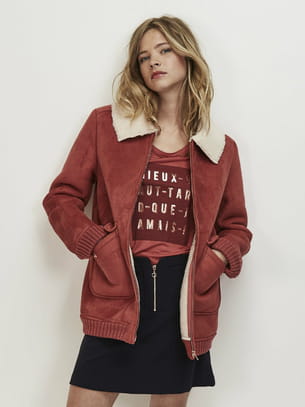 Manteau court en peau retournée synthétique rose corolle avec col écru de I.code