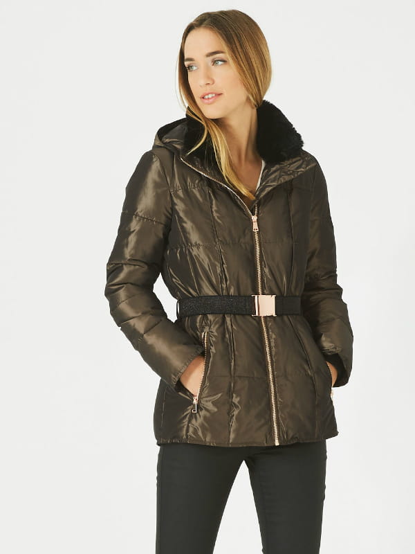 Doudoune mi-longue en coloris kaki irisé avec doublure en fausse fourrure et effet ceinturé de 1.2.3