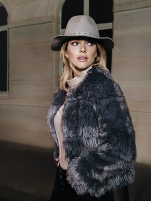 Veste oversize en fausse fourrure entièrement doublée en coloris bleu orage de Morgan X Caroline Receveur