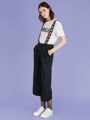 Pantalon à rayures en coupe 7/8ème avec bretelles rehaussées de broderies fleuries en coloris bleu marine de Suncoo