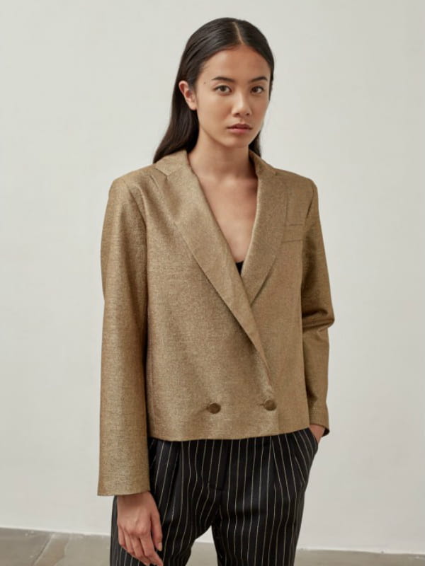 Veste courte croisée à revers en laine lurex avec deux boutons à l'avant en coloris gold de Polder