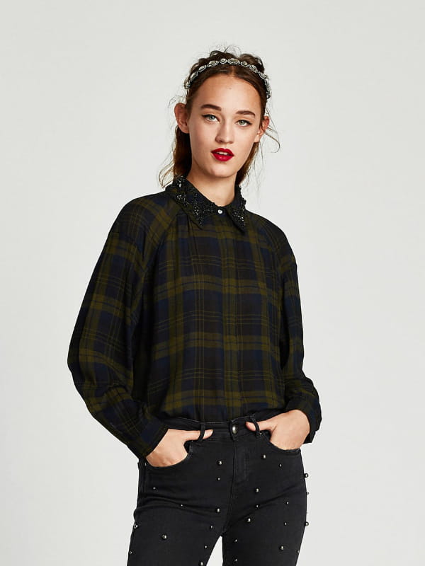 Chemise à carreaux et col bijou en coloris kaki de Zara