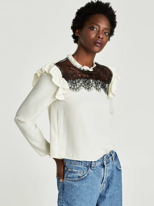 Blouse écrue à manches longues avec volants au niveau des épaules et plastron en dentelle de Zara