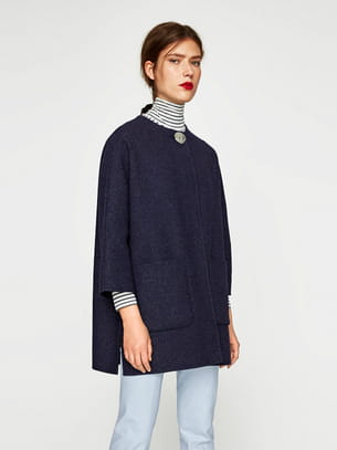 Manteau avec col rond, manches longues et grand bouton sur le devant en coloris bleu marine de Zara