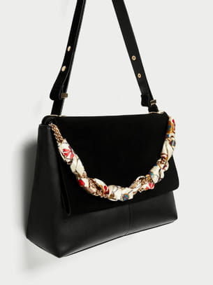 Sac en simili avec rabat en croûte de cuir noir et chaîne dorée recouverte d'un foulard de Zara