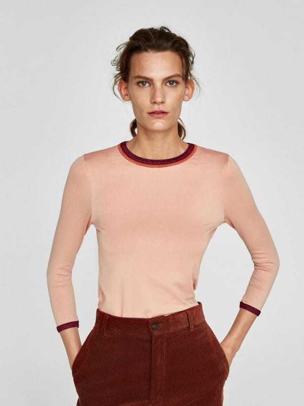 T-shirt à col rond avec détails côtelés scintillants et manches 3/4 de Zara