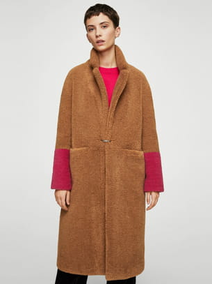 Manteau mi-long en fausse fourrure avec manches longues bicolores camel et rose de Mango