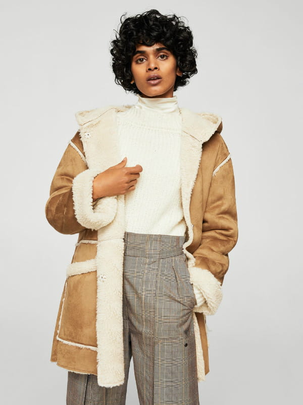 Manteau beige double face façon peau retournée au fini doux et à capuche de Mango