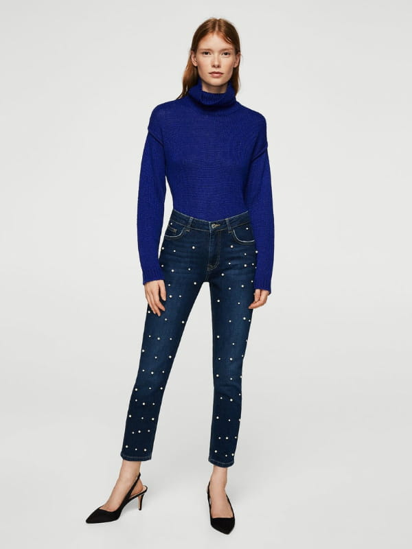 Jean slim en coupe 7/8ème légèrement délavé recouvert de perles de Mango