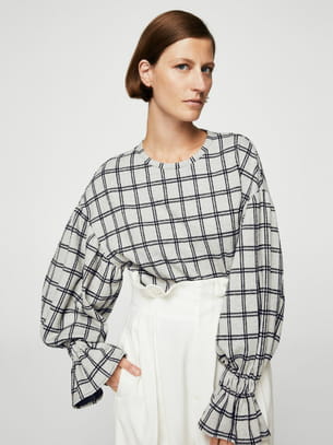 Pull douillet à manches longues bouffantes et imprimé à carreaux noir et blanc de Mango