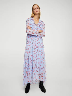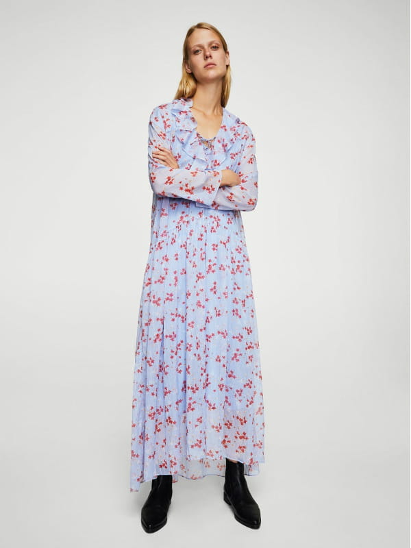 Robe longue bleu ciel en gaze avec volants décoratifs et imprimé floral de Mango
