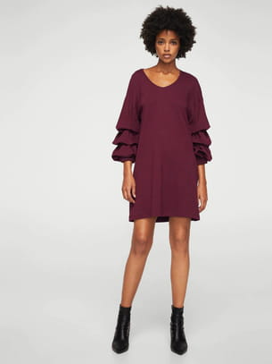 Robe courte grenat en coton à col V et manches bouffantes de Mango