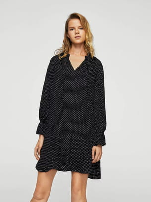 Robe courte noire à imprimé rétro, manches longues avec poignets élastiques et détails volantés de Mango