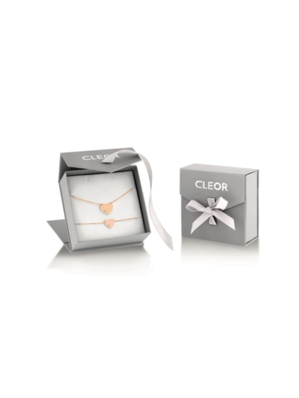 Coffret comprenant un bracelet et un collier avec pendentif en forme de cœur en or 375/1000e rose et petits diamants de Cleor