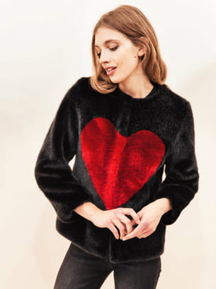 Veste en fausse fourrure noire vegan eco-friendly, fabriqué à Paris avec cœur rouge de La Seine et Moi